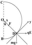 (2)设小球运动到圆周D点时速度最大为v,此时OD与竖直线OB夹角设为α,小球从A运动到D过程,根据动能定理:qE(2R+Rsinα)-mgR(1-cosα)=