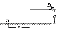 5、计算题 如图所示,水平桌面上放置一个质量m=1kg的小木块,若用木棒击打木块使木块获得水平方向的初速度v0,木块沿桌面滑出左端边沿,落在水平地面上的D点。已知木块的初速度v0=20m/s,桌面距地面的高度H=3.2m,木块落地的位置距桌面左端边沿的水平距离x=4.8m,忽略空气阻力,取重力加速度g=10m/s2。求: