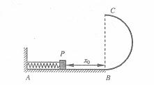 5、计算题 如图所示,粗糙水平轨道AB与竖直平面内的光滑轨道BC在B处平滑连接,B、C分别为半圆轨道的最低点和最高点。一个质量m的小物体P被一根细线拴住放在水平轨道上,细线的左端固定在竖直墙壁上。在墙壁和P之间夹一根被压缩的轻弹簧,此时P到B点的距离为x0。物体P与水平轨道间的动摩擦因数为μ,半圆轨道半径为R。现将细线剪断,P被弹簧向右弹出后滑上半圆轨道,经过C点时,对轨道的压力为重力的一半。求: