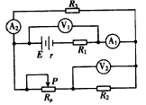 5、选择题 如图所示,四个电表均为理想电表,当滑动变阻器滑动触头P向左端移动时,下面说法中正确的是