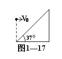 1、计算题 如图1—17所示,小球从倾角为370的斜面底端的正上方以15 m/s的速度水平抛出,飞行一段时间后,恰好垂直撞在斜面上,取g =" 10" m/s2。求:(1)小球在空中飞行的时间为多少?(2)抛出点距斜面底端的高度为多少?