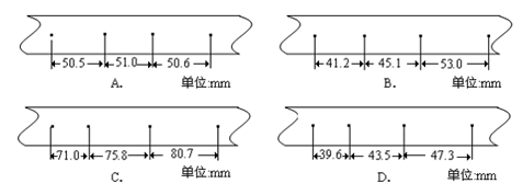 1、实验题 如图是用打点计时器打出的4条纸带A、B、C、D,某同学在每条纸带上取了连续的4个点,并用刻度尺测出了相邻两个点间距离。其中一条纸带是用重锤做的“测自由落体运动加速度”实验时打出的,则该纸带是(所用交流电频率为50Hz)(?)