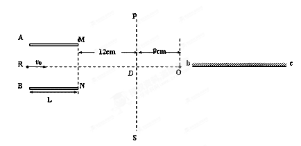 5、计算题  如图所示,两平行金属板A、B长8cm,两板间距离d=8cm,A板比B板电势高300V,一带正电的粒子电荷量q=10-10C,质量m=10-20kg,不计粒子的重力作用,沿电场中心线RO垂直电场线飞入电场,初速度υ0=2×106m/s,粒子飞出平行板电场后经过界面MN、PS间的无电场区域后,进入固定在O点的点电荷Q形成的电场区域,(设界面PS右边点电荷的电场分布不受界面的影响),已知两界面MN、PS相距为12cm,D是中心线RO与界面PS的交点,O点在中心线上,距离界面PS为9cm,粒子穿过界面PS最后垂直打在放置于中心线上的荧光屏bc上.(静电力常数k = 9.0×109N·m2/C2)