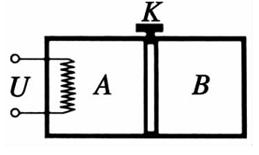 4、填空题  如图所示,一个活塞将绝热容器分成A、B;两部分.用控制闩K固定活塞.保持A体积不变.给电热丝通电.则此过程中气体A的内能 ?.温度??;拔出控制闩K.活塞将向右移动压缩气体B.则气体B的内能 ?