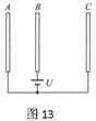 3、计算题 (8分)如图13所示,有三块大小相同平行导体板A、B、C,其中A与B间距是B与C间距的一半,且A、B两板所构成的电容器的电容为10-2μF,电池电压为2V,求A、B两板上的电荷量分别为多少?