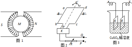 图2是该发电机转子的示意图(虚线表示定子的铁芯M).矩形线框abcd可绕过ad、cb边的中点并与图1中的铁芯M共轴的固定转轴oo′旋转,在旋转过程中,线框的ab、cd边始终处在图1所示的缝隙内的磁场中.已知ab边长L1=20.0cm,ad边长L2=10.0cm线框共有N=8匝导线.将发电机的输出端接入图中的装置K后,装置K能使交流电变成直流电,而不改变其电压的大小.直流电的另一个输出端与一可变电阻R相连,可变电阻的另一端P是直流电的正极,直流电的另一个输出端Q是它的负极.