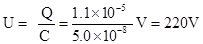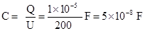 2、填空题 有一个电容器,带电荷量为1×10-5C.两极板间电压为200V,电容器电容为______F.如果使它带电荷量再增加1×10-6C,此时它的电容为______F,两极板间的电压为______V