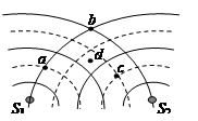 2、选择题 如图所示,S1、S2是两个相干波源,它们振动同步且振幅相同。实线和虚线分别表示在某一时刻它们所发出的波的波峰和波谷。关于图中所标的a、b、c、d四点,下列说法中正确的有( )