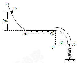 3、计算题 如图所示,光滑曲面AB与水平面BC平滑连接于B点,BC右端连接内壁光滑、半径为r的细圆管CD,管口D端正下方直立一根劲度系数为k的轻弹簧,轻弹簧一端固定,另一端恰好与管口D端齐平。质量为m的小球在曲面上距BC的高度为2r处从静止开始下滑,小球与BC间的动摩擦因数μ=,进入管口C端时与圆管恰好无作用力,通过CD后压缩弹簧,在压缩弹簧过程中速度最大时弹簧的弹性势能为EP。求