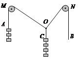 4、选择题 (1)两同学用如图所示方法做共点力平衡实验。M、N为摩擦不计的定滑轮,O点是轻质细绳OA、OB和OC的结点,桌上有若干相同的钩码,某同学已经在A点和C点分别挂了3个和4个钩码,为使O点在两滑轮间某位置受力平衡,另一同学在B点挂的钩码数应是(?)