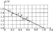 4、简答题 一同学测一节干电池的电动势E和内阻r,如图是他由实验测得的7组数据所画出的路端电压随电流强度变化的关系图,试根据图象求: