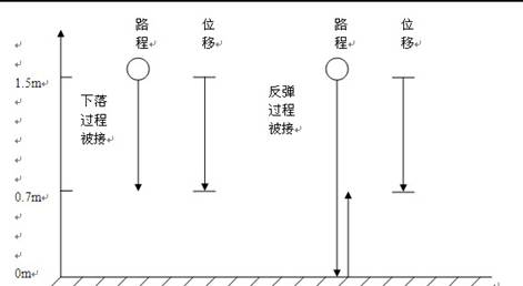 本题解析:如图所示,如果是在皮球下落过程接住的话,路程为0.8米;位移大小也为0.8米。而如果是在皮球被地面反弹后接住的话,路程为(1.5+0.7)米,即2.2米;位移大小仍为0.8米。