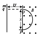 3、选择题 如图所示,一个静止的质量为m,带电量为+q的带电粒子(不计重力),经电压U加速后垂直进入磁感应强度为B的匀强磁场中,粒子打至P点,设OP=x,能正确反映x与U之间函数关系的x—U图如图中的( )