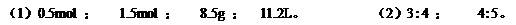 4、填空题 (6分)(1)3.01×1023个NH3分子中含有_________mol氨分子、________mol氢原子,其质量为______________,在标准状态下的体积为______________。