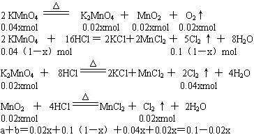 3、计算题 将0.04molKMnO4固体加热,一段时间后,收集到amol气体,此时KMnO4的分解率为x,在反应后的残留固体中加入足量的浓盐酸,又收集到bmol气体(设Mn元素全部以Mn2+存在于溶液中)。试填写: