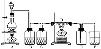 4、实验题  (共18分)如图中,A是氯气的发生装置,B、C是净化气体的装置,D中装铁丝网;反应后E的底部有棕色固体聚集;F是吸收多余气体的装置。
