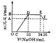 3、选择题 研究发现,硝酸越稀,还原产物中氮元素的化合价越低。某同学取适量的铁铝合金与足量很稀的硝酸充分反应,没有气体放出。在反应结束后的溶液中,逐滴加入4mol/LNaOH溶液,所加NaOH溶液的体积(mL)与产生的沉淀的物质的量(mol)的关系如图所示。