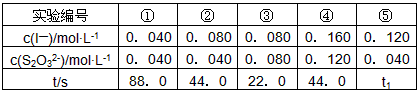 2、实验题 “碘钟”实验中,3I-+ S2O32- = I3-+2SO42-的反应速率可以用I3-与加入的淀粉溶液显蓝色的时间t来度量,