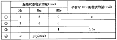 2HBr(g)。已知加入1molH2和2mol Br2时,达到平衡后生成amol HBr(见下表①项)。在相同条件下,且保持平衡时各组分的物质的量分数不变,对下列编号①~④的状态,填写表中的空白: