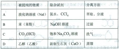 本题解析:A、氯水具有氧化性,能将溴化钠中的溴离子和碘化钠中的碘离子氧化,不会得到溴化钠,故A错误。B、氢氧化钠与苯酚反应生成苯酚钠,而由于苯不溶于水,应该使用分液的方法分离,错误。C、碳酸钠溶液同样会吸收二氧化碳,所以应该换成饱和碳酸氢钠溶液,错误。D、乙酸与生石灰反应生成乙酸钙,为离子化合物。与乙醇相比,乙醇的沸点低得多,所以D正确。