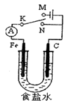 C.若电键K与M连接,若在溶液中滴入酚酞试液,则在石墨棒附近先出现红色