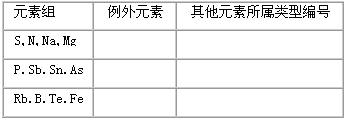 1、填空题 在下列各组元素中,除一种元素外,其余都可以按某种共性归属一类,请选出各组的例外元素,并将该组其他元素的可能归属,按所给6种类型的编号填入下表中。
