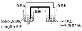 1、填空题 某研究性学习小组根据反应2KMnO4+10FeSO4+8H2SO4=2MnSO4+5Fe2(SO4)3+K2SO4+8H2O设计如下原电池,其中甲、乙两烧杯中各物质的物质的量浓度均为1 mol·L-1,溶液的体积均为200 mL,盐桥中装有饱和K2SO4溶液。
