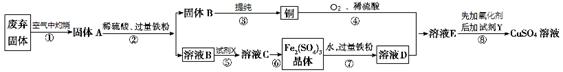 (3) 常温下,铜粉、O2和稀硫酸三者在一起生成硫酸铜反应极慢。当往其中加入溶液D后,随即生成硫酸铜。这一过程中反应的化学方程式依次为4FeSO4 + O2 + 2H2SO4=2Fe2(SO4)3?+ 2H2O和?。溶液D在这一过程中所起的作用是_______。