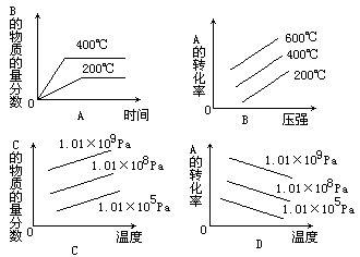 本题解析:此题考查含量(或浓度、转化率等)—温度—压强图象,解析此类题目时,关键是先固定一个量,再结合平衡移动原理讨论另外两个量的关系。首先要知道该反应是气体体积缩小的放热反应.此反应的平衡体系受压强的影响是:增大压强平衡向正反应方向移动,A的转化率增大,B的含量减小,C的含量增大.升高温度,平衡向逆反应方向移动,A的转化率减小,B的含量增大,C的含量减小。A图象表示B的含量随温度升高而增加,则符合此反应。另外,从反应开始到建立平衡,温度越高,到达平衡的时间越短.由于该反应是放热反应,建立平衡后,温度越高,B的含量就应越多。同理推知A、D图象正确,符合上述平衡体系,B、C图象不符合题意。