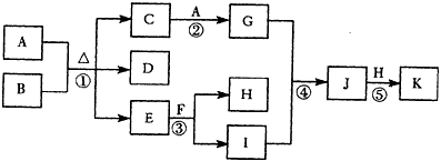 5、填空题 如图所涉及的物质均为中学化学中的常见物质,其中C、D为气体单质,E是目前人类应用最广泛的金属,其余为化合物.它们存在如图转化关系,反应中生成的水及次要产物均已略去.
