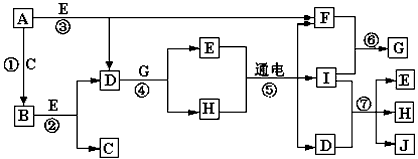 1、推断题  A-J是中学化学中常见的几种物质,它们之间的转化关系如图所示。已知常温下A为固体单质,B为淡黄色粉末,C、F、I为气态单质,E在常温下为液体,且E可由C、F合成,J可用作杀菌消毒剂。回答下列问题