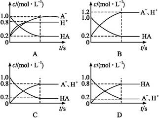 A-+H+。将1.0 mol HA分子加入水中制得1.0 L溶液,下图中,表示溶液中HA、H+、A-的物质的量浓度随时间而变化的曲线正确的是( )