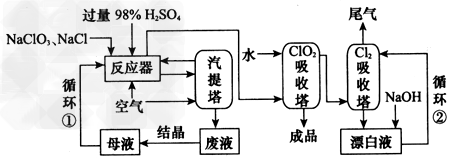 (1)反应器中发生的化学反应方程式为___________?,反应器中生成的ClO2和Cl2?由通入空气驱出进入ClO2吸收塔,产生的混合液进入汽提塔,汽提塔排出废液中溶质的成分主要是________________ ?(填化学式)。 ?