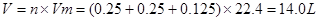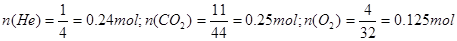 2、选择题 在标准状况下,将1g氦气11g二氧化碳和4g氧气混合,该混合气体的体积约为(?)