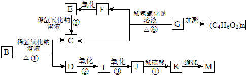 本题解析:由G发生加聚反应生成(C4H6O2)n,可知G的分子式为C4H6O2,其不饱和度为( 2×4+2-6)/2=2,G在氢氧化钠水溶液、加热条件下生成F与C,故G为酯、还含有1个C=C双键,F氧化生成E,E与氢氧化溶液反应生成C,故C为羧酸盐,且F、E、C含有相同的碳原子数目为2,故C结构简式为CH3COONa,故F为CH3CHO(CH2=CHOH不稳定),E为CH3COOH,G为CH3COOCH=CH2,有机物A的分子式为C9H10O2,不饱和度为 (2×9+2?10)/2=5,考虑含有苯环,A在光照条件下生成的一氯代物B,B在氢氧化钠水溶液、加热条件下生成C与D,D含有连续氧化生成J,D含有醇羟基,A含有酯基,故A中含有1个苯环、1个酯基,A在光照条件下生成的一氯代物B,A含有烃基,结合K的一卤代产物只有两种同分异构体,故A为