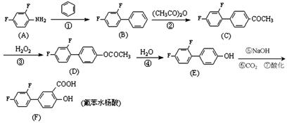 2、填空题  (16分)氟苯水杨酸(diflunisal)是一种新型的水杨酸类消炎解热镇痛良药,具有强效、长效、低毒等特点。一种可行的合成路线如下(催化剂及溶剂等已省去):