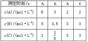 1、选择题 在一密闭容器中加入A、B、C三种气体,保持温度一定,在t1~t4时刻测得各物质的浓度如下表。据此判断下列结论正确的是