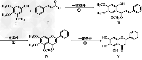 1、填空题 化合物Ⅴ是中药黄芩中的主要活性成分之一,具有抗氧化和抗肿瘤作用。化合物Ⅴ也可通过下图所示方法合成: