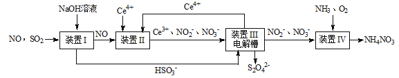 (3)装置II是Ce4+与NO的反应,将NO氧化为硝酸根离子和亚硝酸根离子,自身被还原为Ce3+,离子方程式是NO+3Ce4++2H2O=NO3-+ 3Ce3++4 H+, NO+Ce4++H2O=NO2-+ Ce3++2 H+;