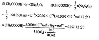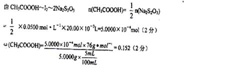 Ⅱ、含量测定:称取5.0000g过氧乙酸试样(液体),稀释至100mL备用。取上述稀释后过氧乙酸试样5.00mL,用0.0100 mol·L-1KMnO4溶液滴定到终点以除去其中的H2O2,随即加入10%KI溶液10mL,加入0.5%淀粉溶液3滴,摇匀,并用0.0500 mol·L-1Na2S2O3标准溶液滴定到蓝色刚好褪去(离子反应方程式为:I2+2S2O32-=2I-+S4O62-),消耗Na2S2O3标准溶液的总体积为20.00mL。