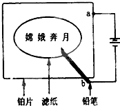 3、选择题 如图某学生设计了一个“黑笔写红字”的趣味实验.滤纸先用硫酸钠、无色酚酞的混合液浸湿,然后平铺在一块铂片上,接通电源后,用铅笔知滤纸上写“嫦娥奔月”,会出现红色字迹,据此下列叙述正确的是( )
