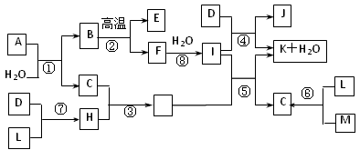 1、推断题 下图所示各物质是由1~20号元素中部分元素组成的单质或化合物,图中部分反应条件未列出。已知D、L、M为气体单质,C、E、H为气体化合物,反应②、④、⑥是化工生产中的重要反应,反应⑤是实验室制备气体C的重要方法。