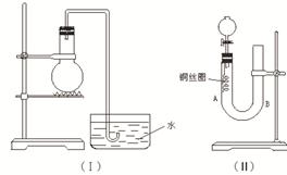 3、实验题 实验室用稀硝酸与铜反应来制备NO气体,如果采用(Ⅰ)装置(烧瓶内加入稀硝酸和铜片,必要时可加热),实验效果不十分理想,因为从观察到的现象不能有力证明反应产物是NO;有人设计了(Ⅱ)装置(橡皮塞下端连有铜丝圈),用来做该实验可以达到满意的效果。根据要求回答下列问题: