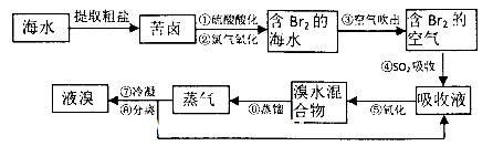 (4)温度过高,产生大量水蒸气,溴蒸气中水蒸气增加;温度过低,溴不能完全蒸出,吸收率低;(5)分液漏斗;(6)“空气吹出、SO2吸收、氧化”的过程实际上是一个溴单质的浓缩过程,与直接蒸馏含Br2海水相比效率更高,消耗能源少,成本降低。