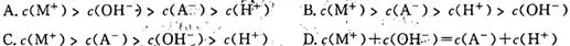 4、选择题 MOH强碱溶液和等体积、等浓度的HA弱酸混合后,溶液中有关离子浓度的比较正确的是