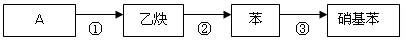 5、填空题  (7分)、已知有机物A只由碳、氢两种元素组成且能使溴水褪色,其产量可以用来衡量一个国家石油化工发展水平。一定条件下,A、B、C、D、E有如下转化关系: