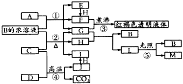 2、填空题 (16分)已知A、B、C、D、E、G、H、I均为气体,J为常见的液态物质,A、B、C、I、M为单质,且M为常用金属,G和H相遇时产生白烟,它们存在如下的转化关系(图中部分反应物或产物已省略),请回答有关问题: