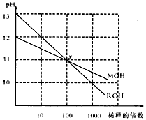 2、选择题 MOH和ROH两种一元碱的溶液分别加水稀释时,pH变化如下图所示。下列叙述中正确的是