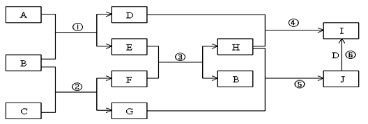 1、填空题 (8分)A、B、C、D、E、G、H、I、J是中学化学常见的9种化合物,E、F、H常温下呈气态,其中F是人类生存不能离开的气态单质,B是常温下呈液态的含两种元素的化合物,化合物C中既含离子键又含非极性共价键,I为白色沉淀,反应③常用于焊接和切割金属,其转化关系如下图,据此回答下列问题: