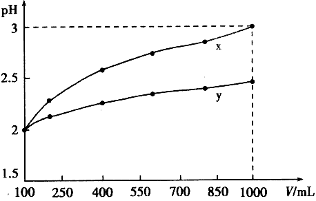 3、选择题 pH = 2的两种一元酸x和y,体积均为100 mL,稀释过程中pH与溶液体积的关系如下图所示。分别滴加NaOH溶液(c = 0.1 mol/L)至pH = 7。消耗NaOH溶液的体积为Vx、Vy,则